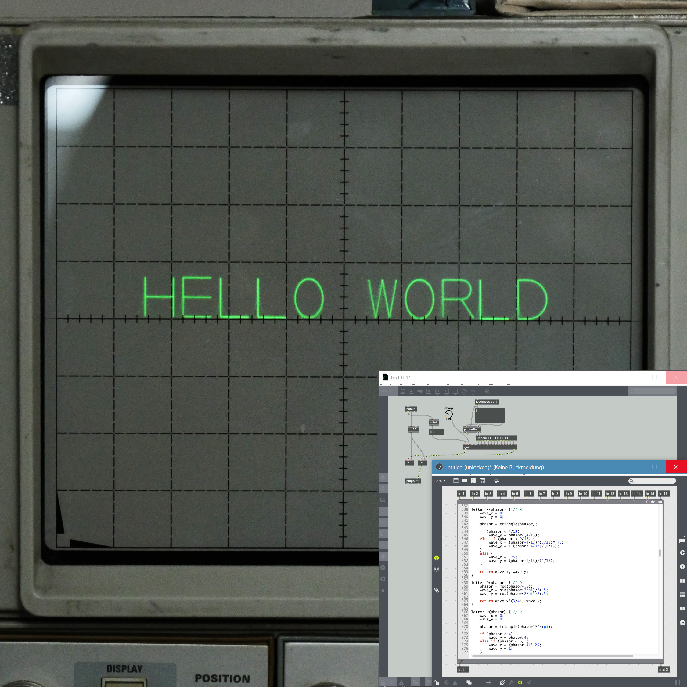 | Description: | A patch that writes text on an oscilloscope with sound. video: https://www.youtube.com/watch?v=qBZoS8d2ov0 |