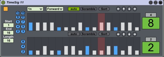 | Description: | Hi, This sequences the Live Global Time Signature. It separately sequences the Numerator (1, 2, 3, ... 16) and Denominator (1, 2, 4, 8, 16) of the Live Time Signature. The blue buttons on the left allow you to quickly change Numerator and Denominator to some convenient values. Enjoy |
