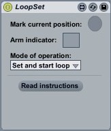 | Description: | A rather simple but (hopefully) useful patch; it allows you to set a loop brace by merely clicking on the "mark" button. Of course the main idea behind this is to midi map the button to a device, for example a foot pedal, which you can then use to create a loop 'on the fly'. The device has 2 modes; by default it will create and immediately start the loop it setup by moving the global transport to the start of the loop and setting the loop switch. Next it also allows you to simply create the loop without taking any further action. As soon as the start of the loop is set the "Arm" indicator will light up. I know at least 1 person already uses this :-) |