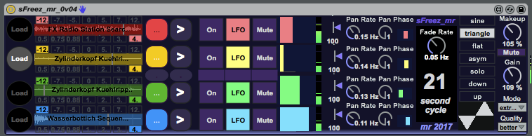 | Description: | sFreez_mr is a sound generator based on samples - and it is the result of updating the gFreez granular version. sFreez_mr allows the playback of four separate samples, and then uses a four-phase LFO and LFO-controlled panning to animate those four components into a constantly shifting atmospheric sound. sFreez_mr is particularly good for slowly evolving background sounds, and it has a number of functions that are specifically designed for live use. In summary, there are four sample players, which can be 'Load'ed with AIFFs (or WAVs), or you can drag and drop samples onto the waveform displays. The top row of little buttons transpose the sample, whilst the lower row of buttons stretch or shrink it. The Play button is the rounded edge button next to the forward (to right) or reverse (to left) button. The next three buttons are linked and only one can be selected at any time for each coloured 'track': On (the sample plays all the time), LFO (the sample volume is modulated by the 4-phase LFO), or Mute (the sample audio is muted). The buttons in the middle are 'group' controls that affect all four samples simultaneously. Then there's a display of the audio level for each sample, a trim for volume, and the Pan LFO controls; frequency and phase (slow it right down and use the phase to fix the pan position in the stereo image). The 4-phase LFO has a rate control, but the main number is how long it takes for a complete cycle (in seconds). The LFO now has additional 'waveforms' that set how the samples are faded in and out, and so I suspect that 'transfer function' is a more accurate description. Anyway, try the new waveforms out: they allow you to vary the number of samples that are mixed at any time. Because of what it does, sFreez_mr doesn't fit into the categories on this site. So I have ticked lots that each cover one facet of what it does... sFreez is 'work in progress': so don't depend on it quite yet... gFreez_mr can be found here: http://www.maxforlive.com/library/device/3777/gfreez-mr The gFreez_mr tutorial is here: http://synthesizerwriter.blogspot.co.uk/2016/08/audio-environments-from-frozen-spectral.html SoundCloud demo1 - wind https://soundcloud.com/martinruss/sfreez_mr-demo-wind SoundCloud demo2 - rain https://soundcloud.com/martinruss/sfreez_mr-demo-rain SoundCloud demo3 - seq https://soundcloud.com/martinruss/sfreez_mr-demo-seq SoundCloud demo4 - loop https://soundcloud.com/martinruss/sfreez_mr-demo-loop SoundCloud demo5 - fx https://soundcloud.com/martinruss/sfreez_mr-demo-fx SoundCloud demo6 - fx2 https://soundcloud.com/martinruss/sfreez_mr-demo-fx2 SoundCloud demo7 - drum https://soundcloud.com/martinruss/sfreez_mr-demo-drum SoundCloud demo8 - drum https://soundcloud.com/martinruss/sfreez_mr-demo-drum2 |