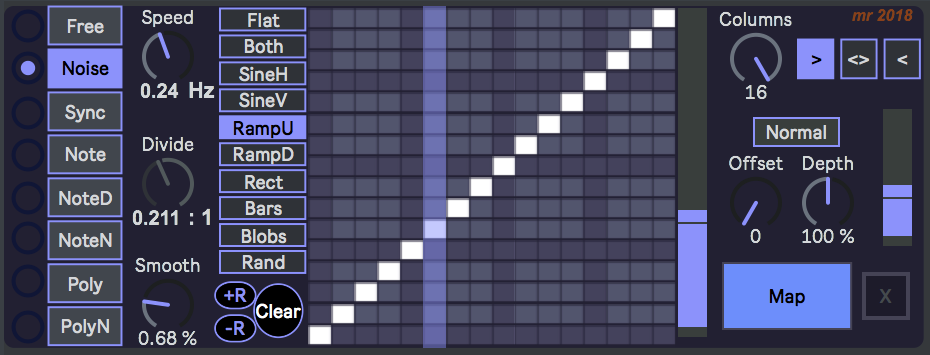 V06: 'Noise' timing source provides jerky progression across the grid instead of smooth. The average speed is the same as the 'Free' clock source. (I will post more details in my blog soon) The 'Offset' control has also been fixed.