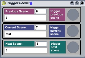 | Description: | I've made a small patch that lets you launch next, current and previous scene (and midi map the functions). I know this is possible in live to, but a well hidden secret :) In addition it will show you track scene numbers and names of previous, current and next scene. The patch is an audio device, so drop in any track! Hope someone find it useful. NB! Just added the possibility to open TriggerScene as a float (doesn't show on the picture) |