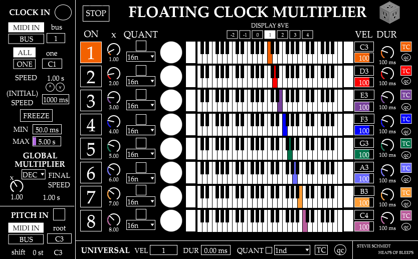 | Description: | This device gives you control over 8 different clock multipliers. These take incoming midi note-ons, time the duration between them and then output 8 clocks (as 8 midi notes) with different speeds that are proportional to that duration. These proportions can be decimal (float) numbers which can create some interesting poly-rhythms that are normally hard to sequence. You could also, send in steady or unsteady midi notes to make steady or unsteady poly-rhythms. You can quantize these rhythms to Ableton's timeline to get interesting euclidean-like rhythms with the turn of a knob. -The speed of these 8 clocks can be simultaneously multiplied again by the Global Multiplier. Giving you ability to quickly change all your clocks speeds at once. This can be set in decimal numbers, integers, or in powers of 2 (exponent mode). -Transpose the pitches of the clocks with incoming midi notes. -Freeze the speed of the clock to keep the same poly-rhythm and re-trigger it whenever you want. -Pop up keyboard interface to more musically sequence the pitches of the clocks. -Use the one-note feature to control different clocks on the same midi track with different notes. -Built-in help file and info text for more explanation. This device can be set to receive incoming midi from a midi bus. The buses it is compatible with are the “Max Midi Sender” device (found in the Max 7 Pitch and Time Machines Pack from Ableton's site) or my free “Heap Midi Sender” device, which is basically the same but has more channels, can send individual midi notes, and is less user friendly. This device is meant to go with my other devices: Heap Midi Sender: https://gum.co/dWKoS Sequencing Clock Multiplier: https://gum.co/COZJj Integral Clock Divider: https://gum.co/PYEAcT Sequencing Clock Divider: https://stevieschmidt.gumroad.com/l/lUjbP demo video: https://youtu.be/A8YwxIjT48o Buy these devices together at a discount in the MIDI clock pack: https://gum.co/ssfUq |