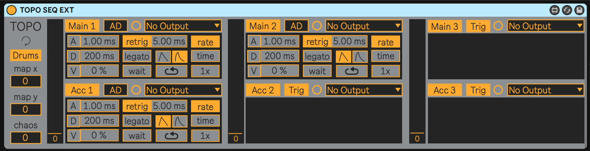 | Description: | Extended version of: http://www.maxforlive.com/library/device/5051/topographic-seq Now with AD envelope on each output. The logic of this device is a portage from an Eurorack module made by: E Gillet - Mutable Instruments - Grids http://mutable-instruments.net/modules/grids The portage has been originally made by: http://motscousus.com/stuff/2014-09_Grids_for_Max4Live You will need 6 DC Coupled DACs, 3 for the main triggers and 3 for the accents triggers. The hardware manual apply for most of it: http://mutable-instruments.net/modules/grids/manual License : released under GPL 3.0 |
