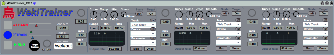 | Description: | WekiTrainer is a Max4Live device that assists in the model training and output mapping process of Machine Learning by communicating directly with Wekinator via Ableton Live. Version 0.7 features include: ◼︎ Mapping of • Record, 〄 Train and ▶︎ Run buttons in Wekinator directly from Ableton via keymapping, Macro or MIDI. ◼︎ 3 Continuous Outputs (Red, Green, Blue). Each output can be mapped onto any device parameter in Ableton. Their corresponding sliders can be mapped and monitored via external MIDI or Macro, helpful when training Wekinator with a new gesture. Also includes a randomizer. ◼︎ 3 Continuous Output Monitors with control of threshold, min. and max. values, output rate in miliseconds (up to 1 second) and compressing, jittering and smoothing of output signal. ❖…also, you can map “Forget Training” button, which clears all previously recorded data in the currently trained model! Video instructions here: https://vimeo.com/296526211 If you enjoy this Max4Live device, please consider donating from 1(฿, €, $, ¥, £, …) to whatever you decide is fair to pay for its use and future development. • Please send your donations via Paypal to hola[at] moiseshorta.audio with the subject: WekiTrainer. If you would like to use it for facilitating a workshop in your community about Machine Learning and Wekinator, please, feel free to reach me to my email: hola [at] moiseshorta.audio You can find the lite version WekiTrainerMini for download here: http://www.maxforlive.com/library/device/5059/wekitrainermini WekiTrainer and WekiTrainerMini requires the Wekinator: a free, open source software originally created in 2009 by Rebecca Fiebrink. It allows anyone to use machine learning to build new musical instruments, gestural game controllers, computer vision or computer listening systems, and more. You can download it for FREE here: wekinator.org Thanks for downloading and happy WekiTraining! ###Many thanks to M4L ninja Carlo Cattano for the help debugging the device! |
