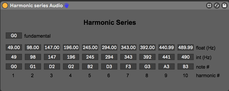 | Description: | A simple Audio device that gives the harmonic series in notes and frequencies of a root/fundamental note. MIDI device version here; http://www.maxforlive.com/library/device.php?id=5114 |