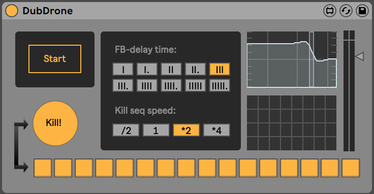 | Description: | This device creates harmonically rich and interestingly modulated delay feedback drone from any audio source. User can control delay feedback time moving the drone into ambient territory by providing slower times and into granular territory by providing faster times. There is also a Kill switch to momentary silence the drone to make additional variations. This switch can be sequenced using 16 step sequencer with four available tempos. Usage: drop DubDrone onto any MIDI or audio Ableton Live track and press Start button to generate the drone from the available audio. Use ‘FB-delay time’ buttons to change the delay feedback time (the more vertical stripes - the shorter is the delay time). Delay times are synchronised with Ableton Live transport. Experiment with Kill button to create variations in the drone. Automate the Kill button with available sequencer. PlugView was tested to work in Ableton Live 10/Max 8.0.3 (macOS Mojave/Windows 10). Short video: https://youtu.be/3PJ_9-d3V6s Price: $1 Version 1.0 (Jan 2019) - Initial release Here you can view my other M4L devices: https://gumroad.com/valery_kondakoff |