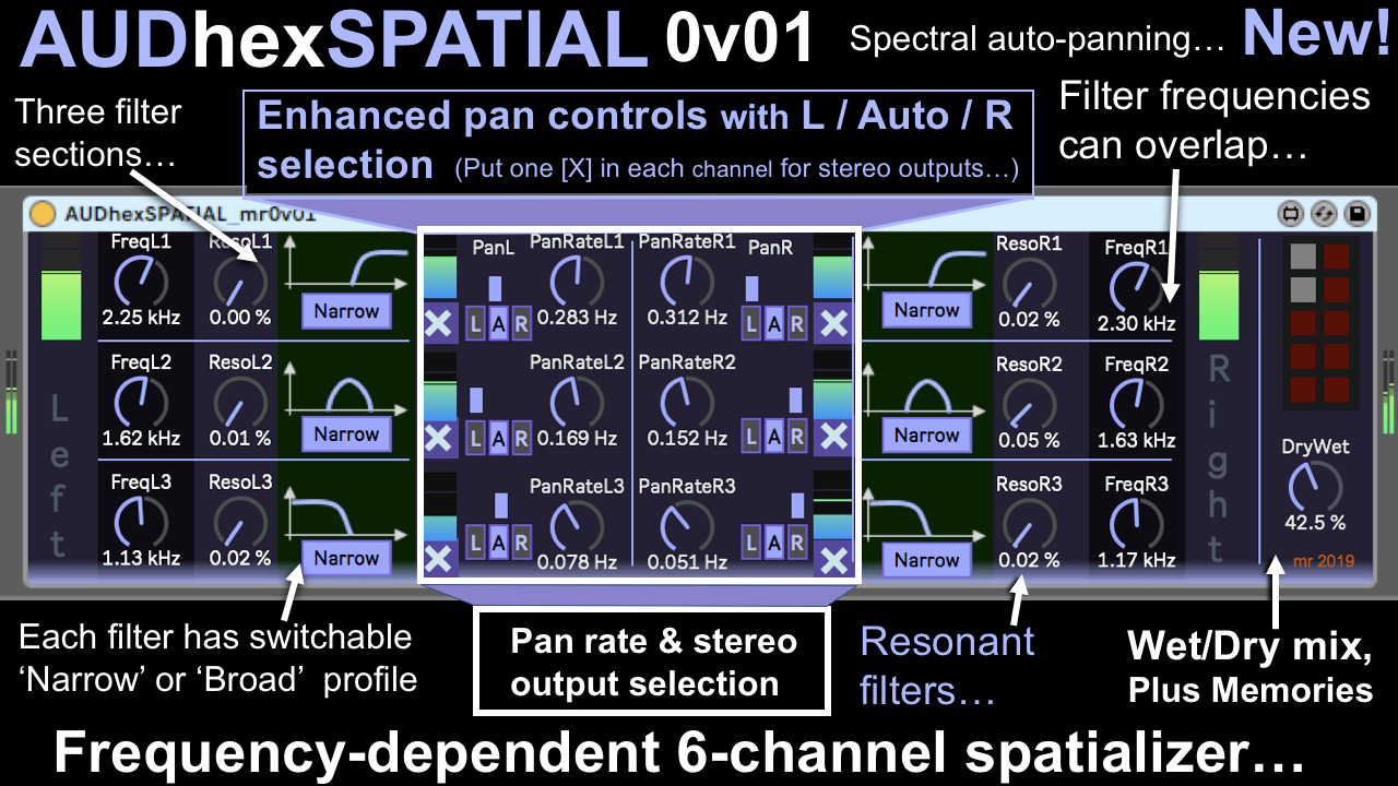 | Description: | AUDhexSPATIAL moves parts of sounds around in the stereo field - so it is a spectral spatializer. The input audio is passed through three parallel filters, and then the outputs are auto-panned across the stereo image. The three filters can be used in several ways, but the most obvious way is to use them to split the audio into three separate bands: The high-pass filter outputs the high frequencies, the low-pass filter outputs the low frequencies, and the band-pass filter outputs the middle frequencies. Each filter output can be panned to hard left or hard right, or can be Auto-panned - controlled by a three position switch: L/Auto/R. But the frequencies of each filter are independent, so there's nothing to stop you putting the high-pass filter below the low-pass, or the band-pass anywhere from low to high. Putting AUDhexSPATIAL before an echo effect can produce interesting results, and if you put it in between two echo effects, then things can get very complex. Enjoy! There are more details on my blog: http://blog.synthesizerwriter.com/2019/04/spectral-auto-panning-in-maxforlive-for.html |