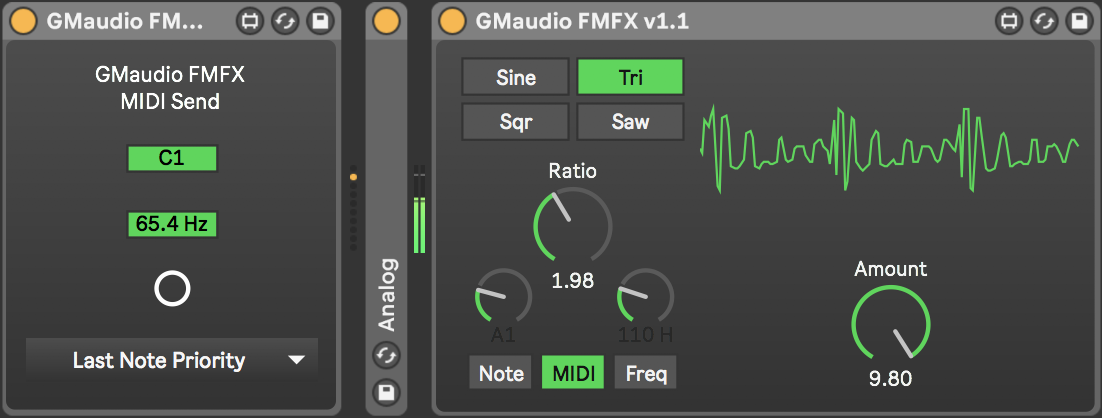 | Description: | Ever wanted to add frequency modulation to any signal? Now you can! New in Version 1.1 - Processing takes place at 2x Oversampling - Parameter output smoothed for pristine modulation - Oscillators normalized (no signal drop between oscillator types) - Greater Ratio and Amount Ranges FM's more and Sounds better! GMaudio FMFX uses an oscillator of your choice to frequency modulate any signal passing through it. You can choose the frequency of the modulator manually via in Hz, Note values or send the device MIDI from the accompanying MIDI Effect. Ratio is multiplication of the modulator frequency and amount is the volume of the oscillator used to 'FM' the signal. All parameters can be modulated or automated. Use it with self oscillating filters to create morphing drones, add texture and tonality to your leads or push your bass lines into FM oblivion. Watch your signal dance with the supplied oscilloscope. You'll never be short of FM Synthesis in your projects, the sound design possibilities for this device are endless. Tips and annotations displayed in Ableton Live's Info Veiw. Couple this with GMaudio WaveFolder v2 for 'East-Coast' complex oscillator awesomeness. (To send this device MIDI, simply add the GMaudio FMFX MIDI0 midi effect to any MIDI or Instrument Track in your Ableton Live Set and select whether you want to use Last, Low or High note priority for the Modulator - Only one can be used per Live Set) |