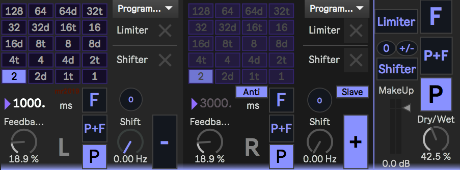 | Description: | This is an early unpolished experimental extension of the AUDpiPOde 'Ping Pong' delay/echo device, but optimised for use as a 'Frozen Echo' looper device in live performance. By using the 'Anti' time-delay compensation mode, the time delays will keep the echoes in sync (at 120 bpm currently!), so you can go from echoes to 'frozen' (select one of the three big common buttons in the right hand panel), and then back to echoes smoothly. Ramped audio fades attempt to minimise the transitions between modes and when adding in the Limiter and Frequency Shifter. In the frozen mode without Limiter or Shifter, then long repeat times should be possible. If you add the limiter or Shifter, then the repeat times may be shorter, and may cause runaway feedback - I have included them as 'in loop' processors so that you can capture a loop of audio, process it and then repeat it until you want to revert back to plain echoes again. As described, this is mainly a 'Performance Echo' effect, but it can also be used as a dual channel echo (with admittedly high RAM and CPU demands!). This is definitely 'work in progress', and is not just a 'slightly better' version of the AUDpiPOde device. Enjoy! |