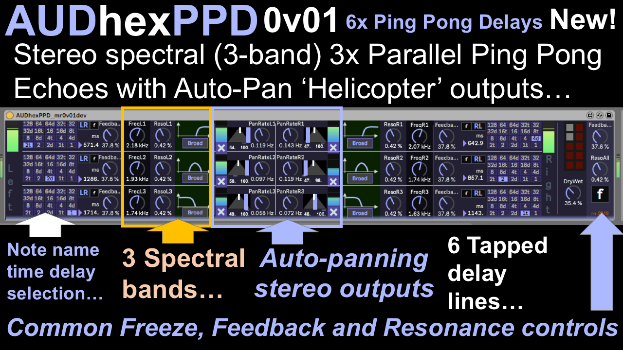 | Description: | AUdhexPPD has 6 spectral ping pong delays and stereo auto-panning 'helicopter' outputs. It has memories, 'common' controls for frequently used parameters (Feedback , Resonance and Freeze), and uses my new 'Pan Position & LFO Modulation' UI widget to reduce the number of rotary controls in the 'panning' block. Despite this it is still a 'wide' device. Three spectral 'free running or synced' ping pong delays per stereo channel puts this effect at the borderline of echo and reverb, and the common controls are intended for live performance or special effects use. Enjoy! |