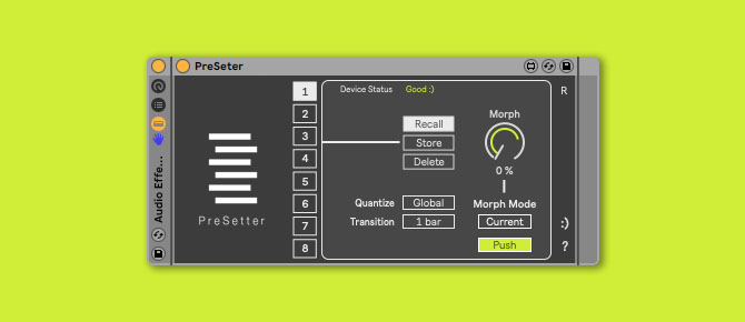Description: PreSetter is a handy device for live performers and music producers that allows you to control the macros of a rack device, and create up to 8 presets which they can be controlled in various ways.
