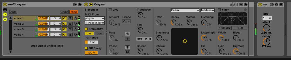 | Description: | This one's a little weird to explain, but it makes sense if you're using sun.polyfier. ( http://www.maxforlive.com/library/device.php?id=567 ) When you use sun.polyfier with, e.g., corpus some sound comes through even when the notes is not triggered. This may not be what you want. If so this effect is for you - it mutes an audio channel if no notes are held on the sun.polyfier virtual midi bus, using a linear attack and decay curve. http://www.maxforlive.com/library/device.php?id=568 |