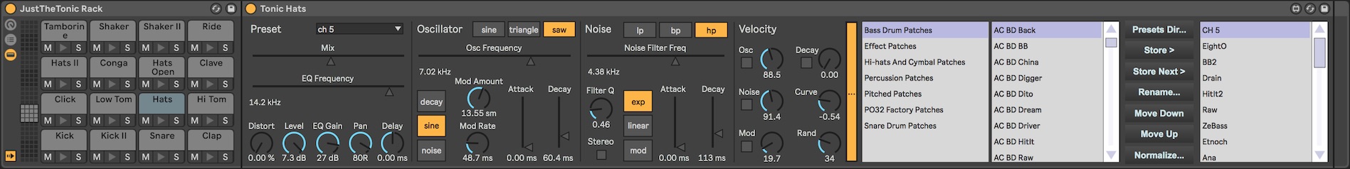| Description: | Just the Tonic is a Max for Live instrument that packages up a single channel of the Microtonic Drumsynth VST, optimising the interface for use within a drum rack and also specifically with the Ableton Push. It features an easy to use preset system with a dedicated browser and editor that allows you to import from preset files directly into the 32 available slots. These can then be scrolled through in realtime directly from the device, even on the Push. Watch the video walkthrough linked below for an overview. To use it, you’ll need a licensed installation of Microtonic which you can download from: https://soniccharge.com/microtonic Note - Just the Tonic is not developed by Sonic Charge, so don’t contact them for support. Version History -------------------- 1.0 - Initial release 1.01 - Added support for Live drum rack choke groups. 1.02 - Fix for light theme. 1.03 - Added additional velocity curve and random controls. 1.04 - Added delay parameter. 1.05 - Inverted function of mix parameter to match Microtonic UI. 1.06 - Added 'normalize' function for smoothing out large changes in volume between presets. Updated example drum rack. 1.07 - Added ability to apply negative delay. 1.08 - Added modulation of envelope decay by velocity. 1.09 - Fixed velocity remapping bug introduced in 1.03. Oops. 1.10 - Added support for exporting to Microtonic preset files. 1.11 - Fixed a bug with negative delay not being restored correctly on load. 1.12 - Fixed a bug reading certain preset files. 1.13 - Added built in Euclidean velocity accents. 1.14 - Attempted to fix issue with corruption of undo queue. |