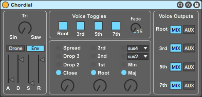 | Description: | A chord oscillator device based on the Chord module (V1) from Qu-Bit Electronix. Chordial is a monophonic chord oscillator with four different pitches quantized to a variety of chord shapes. Features: - Continuously variable waveshape from sine to triangle to saw. - Drone mode for...drones. Envelope mode for traditional monophonic playing. - 4 different chord voicings: Close, Drop 2, Drop 3 and spread. - 4 different chord inversions: Root, 1st, 2nd, and 3rd. - 4 different chord qualities: Major, Minor, and two user selectable qualities (sus2, sus2maj7, sus4, sus4maj7, dominant, half-diminished). - Voice toggles for turning individual chord voicings on and off. Also includes a fade control that applies a variable fade in/out to the toggle. - A voice output section that lets you route individual chord voices to their own audio track. An online user manual is available at the github page for Chrodial. See the url below! |