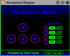 | Description: | Video: https://www.youtube.com/watch?v=ZJVJ-Z1TUDE The Navigation Mapper lets you navigate Ableton: Change tracks/scenes with Key/MIDI mappable arrow buttons. Navigation controls: This device has 4 arrow buttons that go left/right tracks and up/down scenes. If you have 5 tracks, and track 5 is currently selected, and the right arrow key is hit, you have the option for the arrow to loop back around to track 1, or stay on track 5. All buttons have an optional loop back function. |
