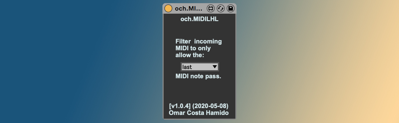 | Description: | och.MIDILHL is a M4L MIDI device to filter multiple incoming MIDI messages. LHL stands for "Last, Higher, Lower". As the name implies it allows to pass only the last note, the higher note, or the lower note of the bunch, depending on the mode selected. Release notes: 1.0.5 - fixed: loaded device in lowest mode would not work 1.0.4 - bug fixes 1.0 - initial release Note1: this device is still a work in progress Note2: if you buy one of my other $2+ devices and post a youtube video tutorial/review you can request this device for free. |