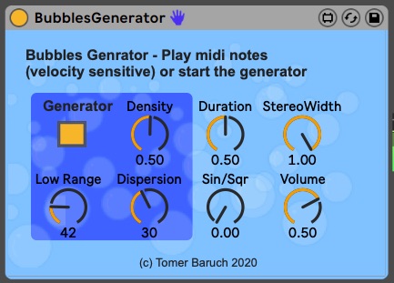 Description: Play single bubbles using MIDI or generate a randomised bubbly environment with control over duration, timbre, density and range.