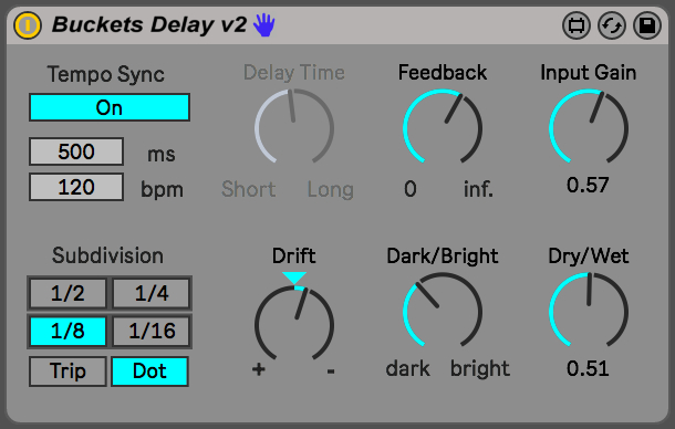 | Description: | Buckets Delay is a Max for Live audio device designed to emulate the classic warm sound of analog, bucket brigade style delay. The standard controls you'd expect from a delay are all there, plus a few more to help the delay fit squarely in your mix. The delay time pushes the limits of what's capable from most bucket brigade circuits, ranging from 50 to 2000 ms. Control the delay time manually or engage Tempo Sync to quickly match the tempo of your current Ableton Project. Use the tempo subdivision buttons to quickly find the sound you're looking for. But let's be honest, analog delays pedals never synced to the tempo of the song perfectly. Use the Drift control to push or pull the delay time slightly off the tempo of the song. This creates a feel more accurate to an actual analog delay. The feedback control does what you'd expect from an analog delay, self oscillating when turned past about 75%. Use the Input Gain dial to control the loudness of the delay signal and add some compression. The Dark/Bright controls the tone of the delayed signal and how much it degrades as it feeds back. For a more transparent delay, turn clockwise toward "bright". For a darker, bucket brigade tone, turn counter-clockwise toward "dark". Lastly, use the Dry/Wet to adjust the mix of the original and delayed signal. |
