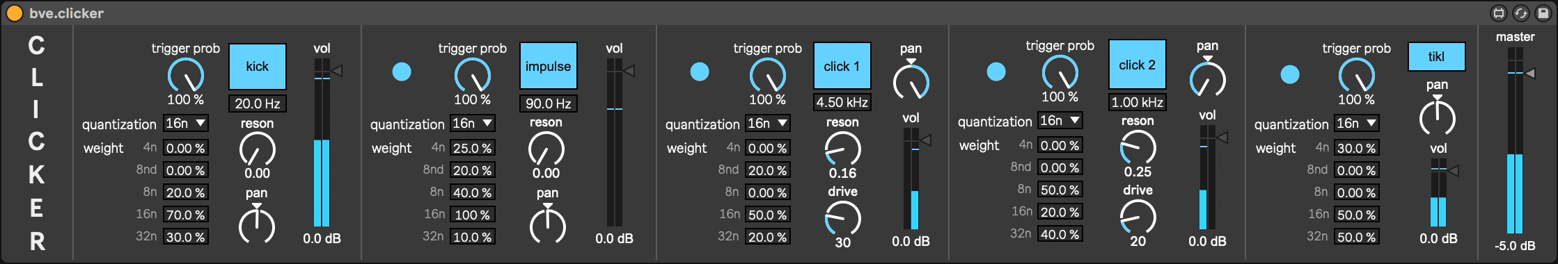 Generate clicky, artefact-like beats by combining 5 'clicker-tracks', each provided with weighted note value probability settings.