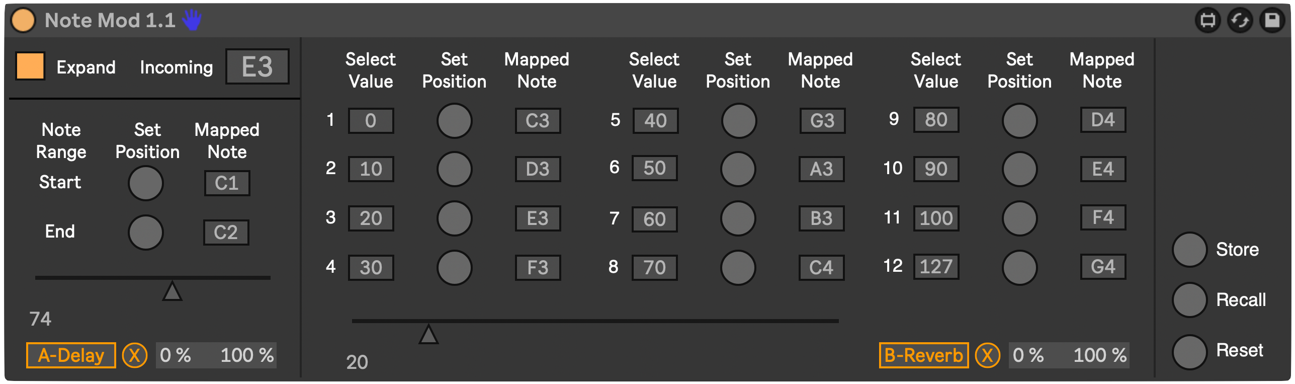 | Description: | A simple device which allows you to map a chosen range of notes to any parameter in Live. Much like a mappable keytracking. You can also map up to 12 individual notes to chosen values on any parameter. More info: https://andrewnorris.uk/note-mod/ ---------------------- Other things I’ve made: https://andrewnorris.uk Buy me a coffee: https://ko-fi.com/andrewnorris |