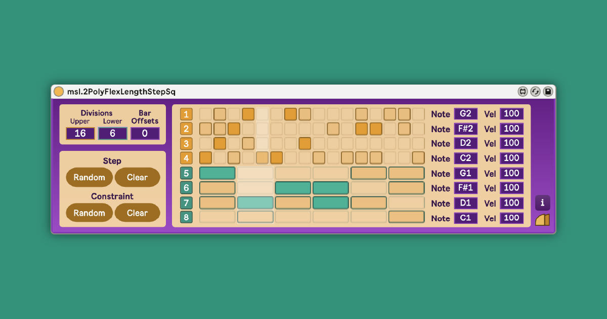 | Description: | ---About--- 2 step sequencers with four lines for flexible beat creation. By combining the number of steps (Divisions) and the length of the loop (Bar Offsets) you can easily create two different polyrhythms. ---Sample Video--- https://youtu.be/lPFIrB1BJWg ---How to use--- [General] Divisions ... You can change the number of grids in the sequencer. Upper ... Change the number of grids in rows 1-4. Lower ... Change the number of grids in rows 5-8. Bar Offsets ... You can add a number between 0 and 4 to the number of beats in the time signature set in Live. For example, if the time signature is 4/4, and you set Offsets to 1, the total length of the grid will be 5 quarter-note beats. [Step] Random ... With each click, the step sequencer cell is randomly selected. Each time you press the button, the selected cell will be increased. Clear ... Set all cells to clear. [Constraint] Random ... Randomly enable/disable the cell of the step sequencer. Clear ... Set all cells back to selectable. [Grid] Grid ...In row 1-4, the cell will turn yellow when selected, and in row 5-8 it will turn green. Each row will output the MIDI specified by "Note" and "Vel" in that row. The length will be the length of one beat, calculated by the number of "Divisions". Note ... Specifies the MIDI pitch. Vel ... Specifies the MIDI velocity. ---Where to get--- For more information, access to https://masalaaudio.com/all/max-for-live/expander/2polyflexlengthstepsq.html This device is also included in our Allspice Set Vol.1. https://masalaaudio.com/products.html |