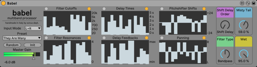 | Description: | Babel is an effect processor with 16 parallel filters, pitchshifters, delays and pan units followed by a thick reverberator, able to transform any kind of sound into a deep evolving texture. |