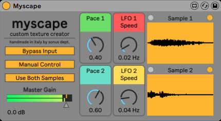 | Description: | Myscape is a texture/drone generator that can create mysterious soundscapes from any couple of sound samples. |
