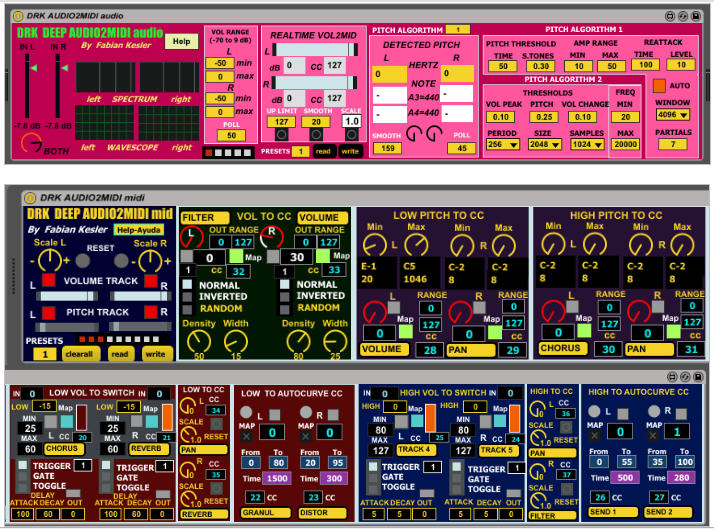| Description: | DRK DEEP AUDIO2MIDI (32 and 64 bits versions) converts from volume and pitch from audio signals to MIDI, taking account of different ranges both in pitch and volume, and working with stereo signal independently for each channel. The project uses 2 devices, one in audio for detection and one for MIDI transform (M4L limitation, but useful in some way to have more organized the functions) Both in 32 and 64 bits. I did as I did not find any similar with all the functions I needed, as independent MIDI use of low and high pitches, low and high volumes, and difference from left and right audio material. I used 2 pitch algorithms with all of the parameters: fiddle and fzero, the 2 wich gave me the best results in my experiments. The detection can be mapped to switch, reverse mode, gate, random, dynamic switches, continuous controller, all with free CC, scaling, various algorithms to avoid detection confusions, signal monitors in various types, etc. See video for all details. It took me a lot of time to experiment and create it, and then to make a video with english subtitles. There are 17 Live projects examples with many of functions and musical possibilities (surely you discover more). Hope you like it and use it both with pre-recorded and alive material. Useful for drums, sax, guitars, human voice and more. In the ZIP: 32 and 64 bits versions, lots of examples. The .amxd audio and MIDI plugins are on the PRESETS folders. Spanish help and pictures VIDEO WITH ENGLISH SUBTITLES https://youtu.be/1FpXIje7cqs NOTE: FIDDLE object is embedded with the patch, but if for some reason you get a message about it is not present, please download it from my Drive and copy to RESOURCES-EXTERNALS-MSP The help file (optional) copy to RESOURCES-HELP 32 BITS https://drive.google.com/file/d/1QQG6_wmOkpVnhPqfJQd7RQDXXozhj6t3/view?usp=sharing 64 BITS https://drive.google.com/file/d/17rqtDf6SxbSyg6RvIH7FWO7R-tTE9r9s/view?usp=sharing Fabian Kesler https://fabiankesler.blogspot.com fvkesler@gmail.com |