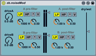 zb.noiseMod multiplies the incoming sound with pink noise in two parallel stages - A and B. Each stage has a modulation pre-filter and a post-filter. |