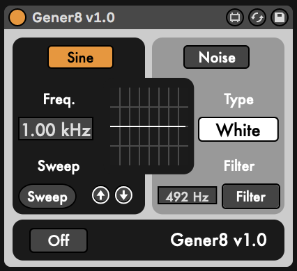 | Description: | Gener8 is a signal generator audio effect allowing you to generate noise and sine signals. This is useful in a variety of situations like detecting resonances in a room, or analysing colouration from other audio devices, or even simply as a noise source for risers - just to name a few applications. The sine generator comes with a sweep function which lets you generate a sine that sweeps through the audible range. The noise generator produces pink or white noise according to the user setting, and it comes with a bandpass filter allowing you to hone in on specific frequency bands of the generated noise. Follow me on IG @nyftymusic |