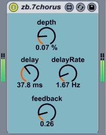 | Description: | zb.7chorus is a constellation of 7 zb.chorus audio effects connected in series and parallel. This creates a more drasitc effect increasing the delay time. The controls for this effect are the same as for zb.chorus and they affect all 7 instances globally. The delay parameter sets the initial delay time in milliseconds. The feedback parameter controls how much of the signal at the output of the delay is fed back through the delay path. The delayRate parameter controls the frequency of random change of the delay time. The depth parameter controls the extent of the random change of the delay time. |