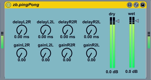| Description: | zb.pingPong is a stereo multi-tap ping pong delay. It allows to set 2 separate feedback delay paths for both the left and right stereo channels. Each of the 4 feedback delays has independent delay time and feedback controls. The delayL2R parameter controls the delay time for the left delay path that feeds back into the right delay path. The gainL2R parameter controls the feedback amount for that tap. The delayL2L parameter controls the delay time for the left delay path that feeds back into the L2R path. The gainL2L parameter controls the feedback amount for that tap. The delayR2L parameter controls the delay time for the right delay path that feeds back into the left delay path. The gainR2L parameter controls the feedback amount for that tap. The delayR2R parameter controls the delay time for the right delay path that feeds back into the R2L path. The gainR2R parameter controls the feedback amount for that tap. |