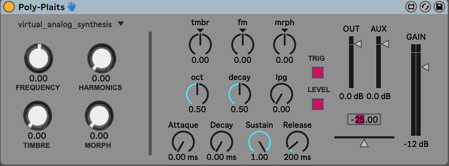 | Description: | Mac OS only A few days ago, some people commercially released devices based on Mutable Instruments modules, with relatively high prices. The problem is that the code of Mutable modules is open source, and the externals used in these m4l devices too. Even if there is some work behind it (and I'm sure there is), it's not very ethical, and far away from open-source philosophy. --- Anyway, it was the occasion for me to learn a bit about poly~, and try a polyphonic version of Plaits ! It has 6 voices of polyphony, ADSR controls, and all the classical controls found in the Volker Böhm's external. I also added a crossfader to fade between OUT and AUX output, and a stereo control to adjust the panning of the 2 outputs at the same time. And it is Push mapped. And it is free ! *1.1 : fixed an issue with automation *1.2 : oups, i previously wrote Attack in french (thanks @klingklangmatze) *1.5 : UI / color improvement & M1 compatibility --- All the hard work comes from : - Émilie Gillet, creator of these modules - Volker Böhm who mades theses externals -> (https://vboehm.net/2020/02/mutable-instruments-max-port/) - cipp0 (https://maxforlive.com/profile/user/cipp0) for the pretty encoders -> (https://maxforlive.com/library/device/6402/nube-texture-synthesizer) Let me know if there is any bug or thing to add :-) |