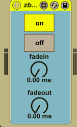 | Description: | zb.fade is a one-click fade-in/fade-out audio effect. It is particularly useful for live performance purposes, especially when trying to save MIDI controller continuous controllers (such as faders) for other tasks. The fadein parameter sets the duration of the fade-in in milliseconds. The fadeout parameter sets the duration of the fade-out in milliseconds. The on/off tab triggers the fade-in (when set to on) and fade-out (when set to off). |