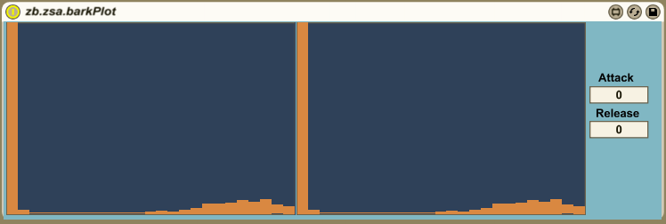 Description: zb.zsa.barkPlot is a plotting device which displays the left and right signal. The spectrum of the signal shown is displayed in the Bark scale (a psychoacoustic scale which corresponds to the 24 critical frequency bands of hearing).