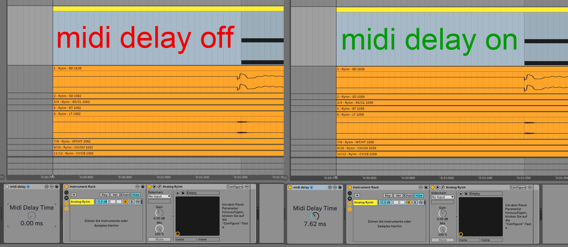 | Description: | It delays midi data 0-20ms Born because of a latency problem of Analog Rytm/ Overbridge. Seems Overbridge have an own latency corrections, but also seems it´s working not as good as it should. I got a negative delay of aprox 8ms during record (via USB/Overbridge). The Ableton track corections havn´t any influence of this. This tool delay (delay time can set during play/record) the midievents (maximum 20ms), so the midi notes stay in grid and the recorded track is also on time. |