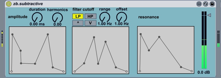 | Description: | zb.subtractive is a subtractive synthesiser, which utilises 2 cross-fadable oscillators and a state-variable filter. It also features breakpoint envelopes, which can be used to automate the amplitude and filter parameters. The duration parameter sets the global length of the breakpoint envelopes in ms. The harmonics dial crossfades between a sine and square wave oscillator. The higher the value of the parameter is, the more harmonically rich the sound. The leftmost breakpoint envelope controls the amplitude value over time. The middle breakpoint envelope controls the cutoff frequency of the filter over time. The rightmost breakpoint envelope controls the steepness (resonance) of the filter. The LP HP ^ V tab switches the type of the state variable filter between low-pass, high-pass, band-pass and notch. The range parameter controls the size of the range of the cutoff frequency sweep breakpoint envelope. The offset parameter shifts the position of the above range. |