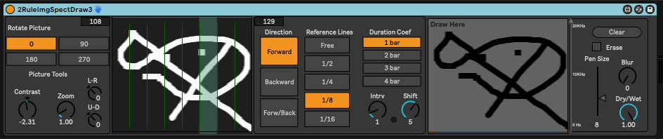 | Description: | 2RuleImgSpectDraw is audio spectrum modifier by drawing . Time line from left to right, frequency line from bottom to top. With this patch, interesting formant-style filters can be obtained by drawing pictures on the right window and selecting interval from left window, and suppressing frequencies during playback. You can get very unique filter effect by drawing. News in Ver 3: The picture was disappearing when Ableton was reopened: . bug fixed fixed. synchronization related bugs are fixed. Copy the 2RuleImgSpectDraw3 with the container directory!! to user max patch main directory. In the container directory images will be created when the 2RuleImgSpectDraw3 will be opened. so MaxMsp main directory will stay clean. |