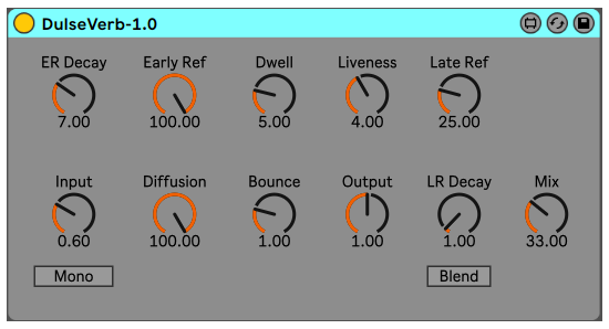 | Description: | DulseVerb is an algorithmic reverb for Max4Live that recreates the sound of early reverberators. It has three sections: early reflections, diffusion and late reflections. Controls: ER Delay: Decay time factor of early reflections. Early Ref: Level of early reflections. Dwell: Decay time factor of diffused reflections. Liveness: Amount of feedback added to diffused reflections. Late Ref: Mixes between the diffused reflections and the output of the stereo matrix filter. Only effects the diffused portion of the reverb. Input: Gain of the input signal going to the reverb. Diffusion: Mixes between the early reflections and the diffused reflections. Bounce: Gain of diffusion filters, unity at 1.00. Output: Gain of the output of the reverb before mixing with the dry signal. LR Decay: Decay time factor of late reflections. Mix: Mixes between the dry signal and the reverb. Mono/Stereo: Input mode to the reverb. In Mono mode, only the left signal is passed to the reverb. In Stereo mode, both channels are summed and passed to the reverb. Blend: Narrow the stereo image of late reflections. Demo: https://www.youtube.com/watch?v=wF7J9rqN-88 |