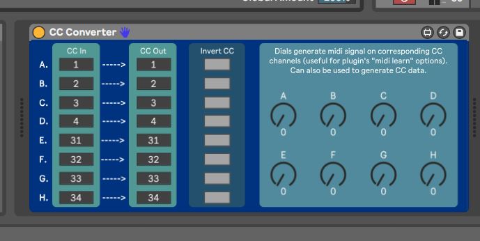 | Description: | This simple device converts midi CC channel numbers. I made it as I use a couple of apps on my phone as XY pads which are set to specific CC numbers. However, I found that different VST instruments have different channels assigned to their X/Y pads so rather than keep editing the templates on the phone I made this to convert the incoming CC messages to the corresponding CC channels of the plugins. Both CC in and CC out are assignable. Obviously you can also use this device to map the x/y pads to any element in any VST instrument that accepts cc instructions. In version 2 I added option to invert CC data per channel - I found couple of occasion that my X/Y pad layouts did not match the plugin's pads (x or y were inverted) so this should fix this issue. I have also added a dial per channel that sends midi signal on the corresponding converted CC channels. This is useful if you are trying to use the "midi learn" option on any plugin - normally x/y pads sends midi signal on two channels which make it hard to use midi learn. The dials can also be used to generate cc midi data (try to automate them with an LFO for example) I made a stripped down version with 2 CC channels - https://maxforlive.com/library/device/8243/mini-cc-converter If you are not sure on how this device works just throw midi monitor device instances before and after the converter and you will see whats going in and out |
