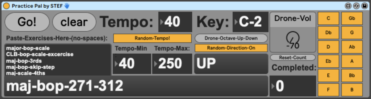 | Description: | https://youtu.be/G_f-8Zv5iB0 Your new Practice Pal :) Type or copy/paste a list of musical exercises, and let Practice Pal choose what to play, how fast to play it, and in what key to play it in! Features include fully customizeable randomization, a built-in drone, auto-syncing with Ableton's transport, and a counter to keep track of how many exercises you've done. Gamify your practice with the Direction Randomizer, and enjoy a stimulating and engaging practice experience. Compatible with Ableton Live 11 and 10. Other versions of Ableton have not been tested. Max for Live is required. |