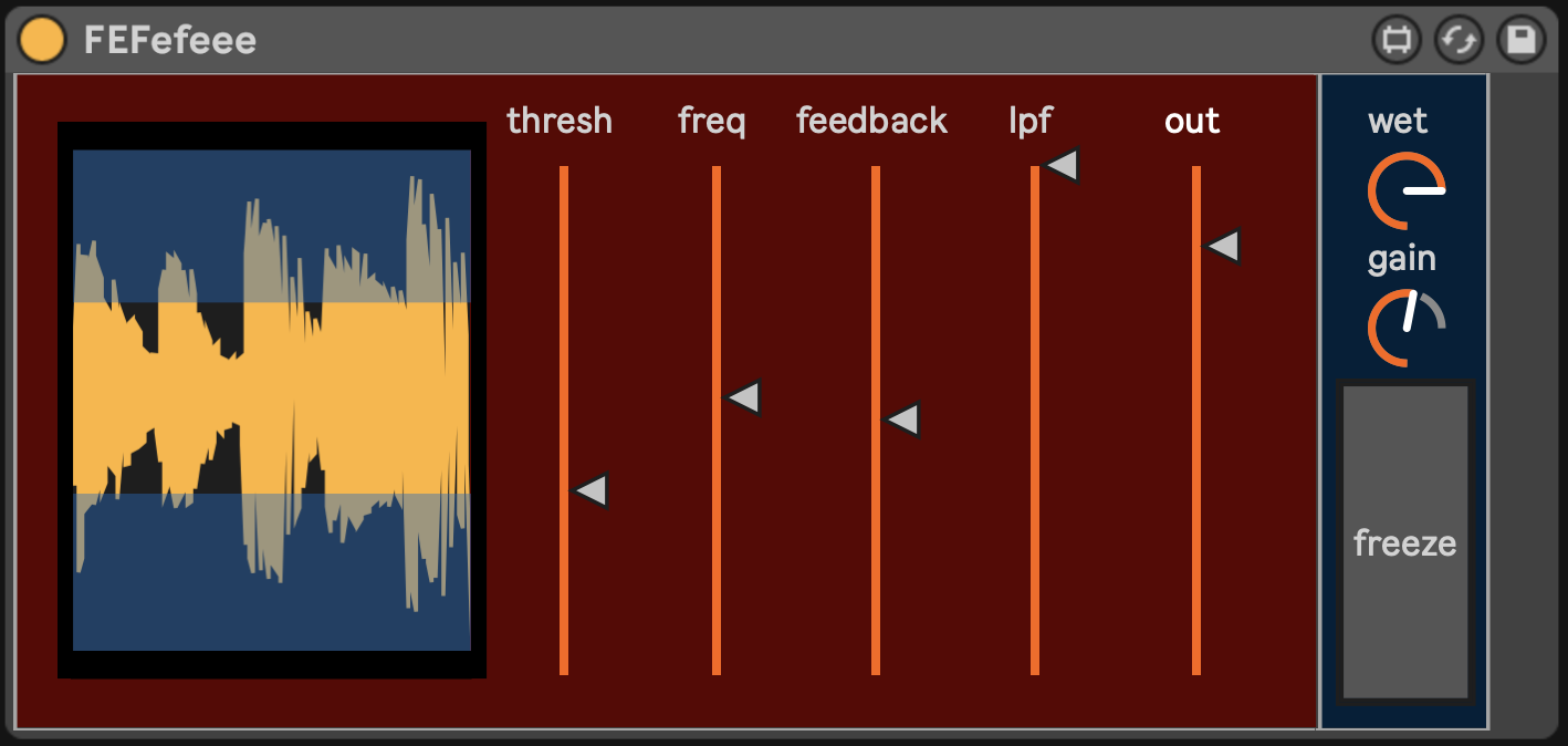 | Description: | FEFefeee is a versatile Max for Live audio effect device that excites a micro-delayed feedback network, à la Karplus-Strong synthesis, whenever the audio input signal surpasses a user-defined threshold. The feedback loop can also be frozen and manipulated in real time, allowing for a wide range of experimental possibilities with incoming audio signals. It works with any audio signal, including LFOs and impulse responses. For a more detailed walkthrough, please see this documentation video: https://youtu.be/DsCcj1JM19w |