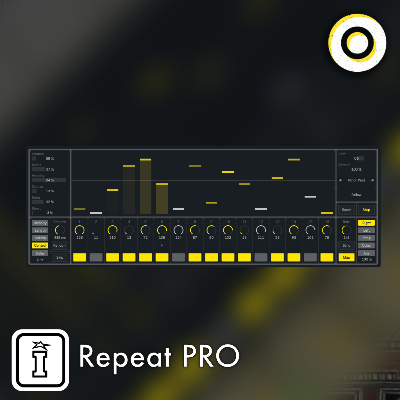 | Description: | Repeat Pro is a Max for Live MIDI effect, designed to easily program rhythmic and melodic patterns step by step, then played by synthesizers, samplers and other instruments, both inside and outside Live. The follow up to the hugely successful Repeat device, Repeat PRO has been rebuilt from the ground up with a swathe of new features. The whole device is exclusively driven by a sixteen step sequencer, which among other parameters allows to set a different note, velocity, length, octave, control and delay amount for every single step. Part of Repeat Pro’s magic resides on the uncertainty factor that surrounds its behavior and defines the state of its most important parameters. Main features and functions Sixteen step MIDI sequencer. Note, Velocity, Length, Octave, Control and Delay values for each step. Complete Push integration (only for Push 2). Store and recall up to 64 presets. Control Change messages for external instrument modulation. Program Change messages for external instrument preset control. Map function for Ableton Live parameter modulation. Mute and Skip buttons. Random function applied over all the individual step parameters. Random window allows to constantly randomise most importan parameters. Five sequence Playback modes: Right, Left, Pong, Other and Any. Three Rate modes: Sync, Free and Track. |