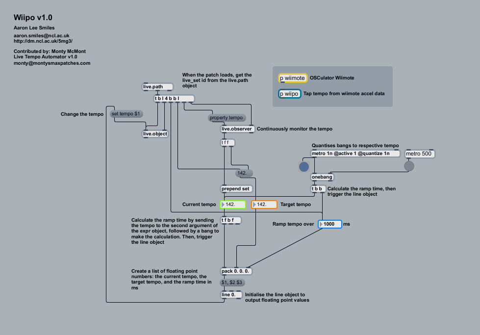 | Description: | Live Gestural Tempo Control using WiiMote. Built by 5mg3: http://dm.ncl.ac.uk/5mg3/2011/08/18/wiipo-v1-0-gestural-tempo-control-for-max-for-live-using-wiimote/ Contributed by monty: http://www.montysmaxpatches.com/ Live Tempo Automator v1.0: http://www.maxforlive.com/library/device.php?id=386 |