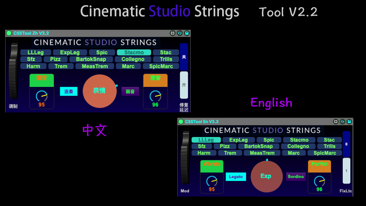 | Description: | 1.Based on version 1 (version 1 is stoped. ), removed the redundant "Main Articulations" and put the "All Articulations" in a more prominent place; 2. In addition to the above point 1, other functions of version 1 are reserved and optimized; 3. Added the function to fix latency. Of course, if you are used to solving this problem in other ways, you can turn off this function. 4.The UI has been redesigned to become more compact, and dynamic visual effects have been added to the expression control wheel. For the demonstration video about solving the problem of latency, you can go here to learn : https://www.bilibili.com/video/BV1fb411X7qy/?share_source=copy_web&vd_source=71861225a7261e414d8e3a0bdacd4694 1.在版本1的基础上(版本1已停止发布),去除了多余的“主要技法列表”把全部技法放在了更显眼的地方; 2.除上述第1点外,版本1其他的功能保留和优化; 3.增加了解决乐器发声延迟问题的功能。当然,如果您习惯于其他方式去解决这个问题,您可以把这个功能关掉。 4.UI重新设计,更工整并且在表情控制轮上增加了动态视觉效应。 关于解决延迟问题的演示视频,您可以到这里了解(请忽略UI差异):https://www.bilibili.com/video/BV1fb411X7qy/?share_source=copy_web&vd_source=71861225a7261e414d8e3a0bdacd4694 V2.1 update log: 1.Add "Sordino" and "Legato" button to switch those function; 2.Further improve the internal logic of fixing latency. V2.1更新日志: 1.添加“弱音”和“连奏”按钮以切换这些功能; 2.进一步改进修复延迟的内部逻辑。 V2.2 update log: 1.Fixed the latency issue of the first note after switching articulation to sustain/legato every time (it always sounded earlier than other notes). 2.Fixed the issue where, after stopping playback at a certain position and then seeking to another position to resume playback, there was a potential latency correction error if the articulation at the stopped position was different from the new position. V2.2更新日志: 1.修复了每次把演奏技法切换到连奏/长音后,第一个音符的延迟问题(它总是比其他音符要更早发声); 2.修复了在某个位置停止了播放,然后再定位到其他位置进行播放,如果停止的位置和新定位的位置的演奏技巧不一样,有可能会出现延迟修复错乱的问题。 |