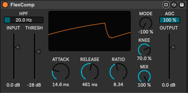 | Description: | After saying it couldn't be done properly, I decided to find out if it was possible to build a decent compressor in Max without a gen~ licence :) I initially set out to make something smooth (opto / vari-mu style) with slow attack/release and a gentle knee. It seemed easy enough to keep adding features so I may have gotten a little carried away (perhaps this is the hallmark of what is becoming my "flex" series of devices... or all my devices for that matter). One quintessential property of an optical compressor is the feedback topography. That is to say, the compressor reacts to the output, rather than the input. I got to thinking... why does it have to be one or the other? So I included a mode control to mix between feedback and feedforward side-chain signals. This is unique to this device, as far as I know. |