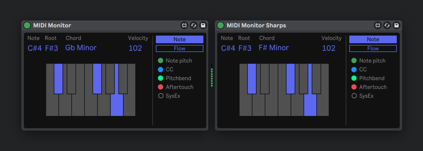 | Description: | Ableton stock MIDI Monitor device tweaked to display chords in sharps (#) instead of flats (b) |