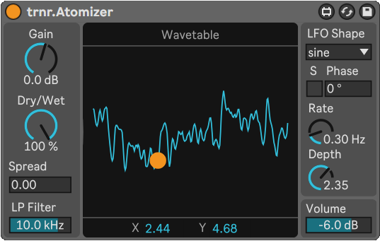 | Description: | Inspired by a famous 8-Bit distortion guitar pedal, Atomizer builds upon the idea of using lookup tables for waveshaping. The input signal is converted to 8-Bit and then remapped to the selected wave resulting in rich and complex distortion. The wavetable itself is organized in an 8x8 matrix making it possible to seamlessly scan through the waves with the XY control or the integrated LFO, resulting in morphing waves reminiscent of wavetable synthesizers. Besides normal stereo operation, Atomizer is also capable to turn mono into stereo signals by introducing a small offset in the selected wavetable between the left and right channels. Atomizer comes prepackaged with a selection of wavetables. More can be found on www.waveeditonline.com. While it is designed to work with banks of 64 waveforms with a wave length of 256, any sample can be loaded into the device but will be truncated to one channel and 16384 samples. Features: - Wavetable Waveshaper supporting banks of 64 waveforms with a wave length of 256 - XY Control or LFO to scan through wavetables - Seamless morphing between waves - LFO with 6 shapes (sine, triangle, ramp up, ramp down, rectangle, random), phase control and beat sync - Stereo spread control - Low pass filter to tame high frequency content - Gain, Dry/Wet and Volume controls |