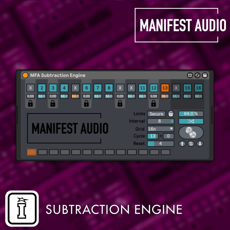 | Description: | Use Subtraction Engine to easily mute all notes on any given step of a MIDI pattern via any mappable MIDI controller to create compelling variations of your patterns while performing, or to experiment in the studio. Instantly disable or enable all steps with dedicated controls, or use the invert button to swap the mute state of all unlocked steps with a single gesture. Subtraction Engine’s large Dice button randomises all eligible step states to instantly produce unique variations on a MIDI sequence. The Global Probability Amount slider governs the chance of step states flipping for all steps simultaneously — but step probabilities can also be controlled individually. By reducing a step’s probability to 0% you can lock it, thereby excluding it from randomisation for highly programmable control. Enbabling Auto Dice mode allows you to create infinitely evolving permutations of any MIDI fed into Subtraction Engine, randomising all unlocked steps at the specified Interval, set in bars. This could be used to generate new melodic riffs at, for example, Intervals of 2 or 4, or to create continuous variations on percussion patterns (with locked steps perpetually exempt, of course). Adjust cycle settings to impose polymetric note gating on patterns of any length. Use the reset function to restart the cycle at a given interval also set in bars. Optimized for Push with full automation labels and Info View annotation, Subtraction Engine is ready for high-level play straight away. Experiment, have fun, and capture results to new MIDI or Audio Clips by recording them to other tracks in Live. HOW DOES SUBTRACTION ENGINE DIFFER FROM LIVE 11’S NOTE PROBABILITY? New step activation states can be generated automatically at specified intervals, for example creating a new variation every 2 bars, 4 bars, etc., producing continuous yet coherently phrased variations. Chords are toggled as a single unit — as opposed to Live 11’s probability, which treats all notes individually Shorter step activation cycles layered with longer MIDI phrases easily create dynamic yet hypnotic rhythmic patterns while adhering to the melodic contour of the original MIDI input All steps can be toggled on, off, or inverted simultaneously for highly engaging performance control Parameters are available for automation and MIDI or key mapping Works with Live 10 Suite Includes: Subtraction Engine device, 16 presets, PDF user guide. Note: Subtraction Engine does not produce MIDI notes — notes must be fed into it. |